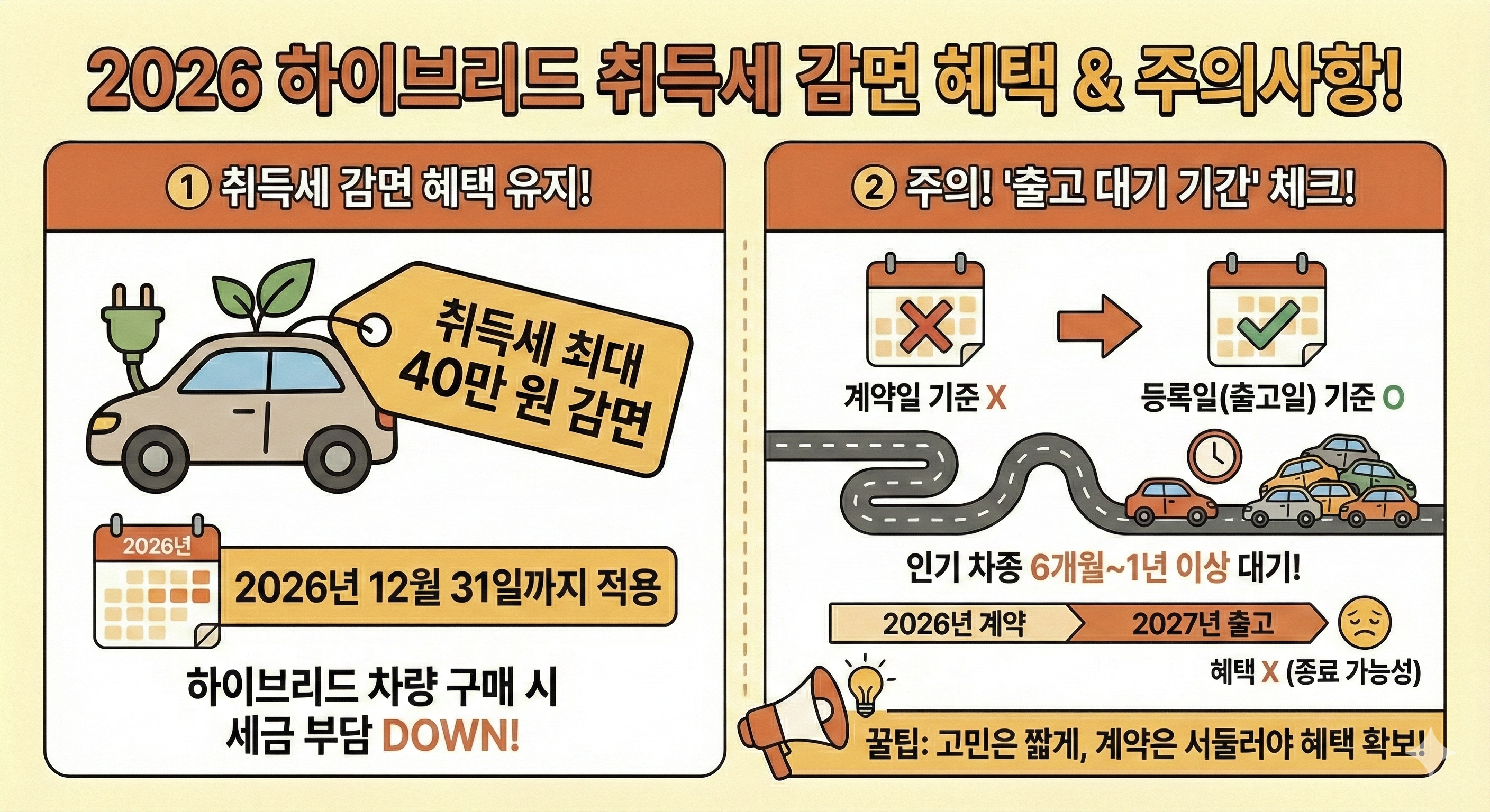 그리고 요즘 대세인 하이브리드 차량 눈여겨보시는 분들도 많으실 텐데요, 다행히 취득세 감면 혜택도 살아남았습니다. 하이브리드 차를 살 때 취득세를 최대 40만 원까지 깎아주는 혜택이 2026년 12월 31일까지 유지되거든요.