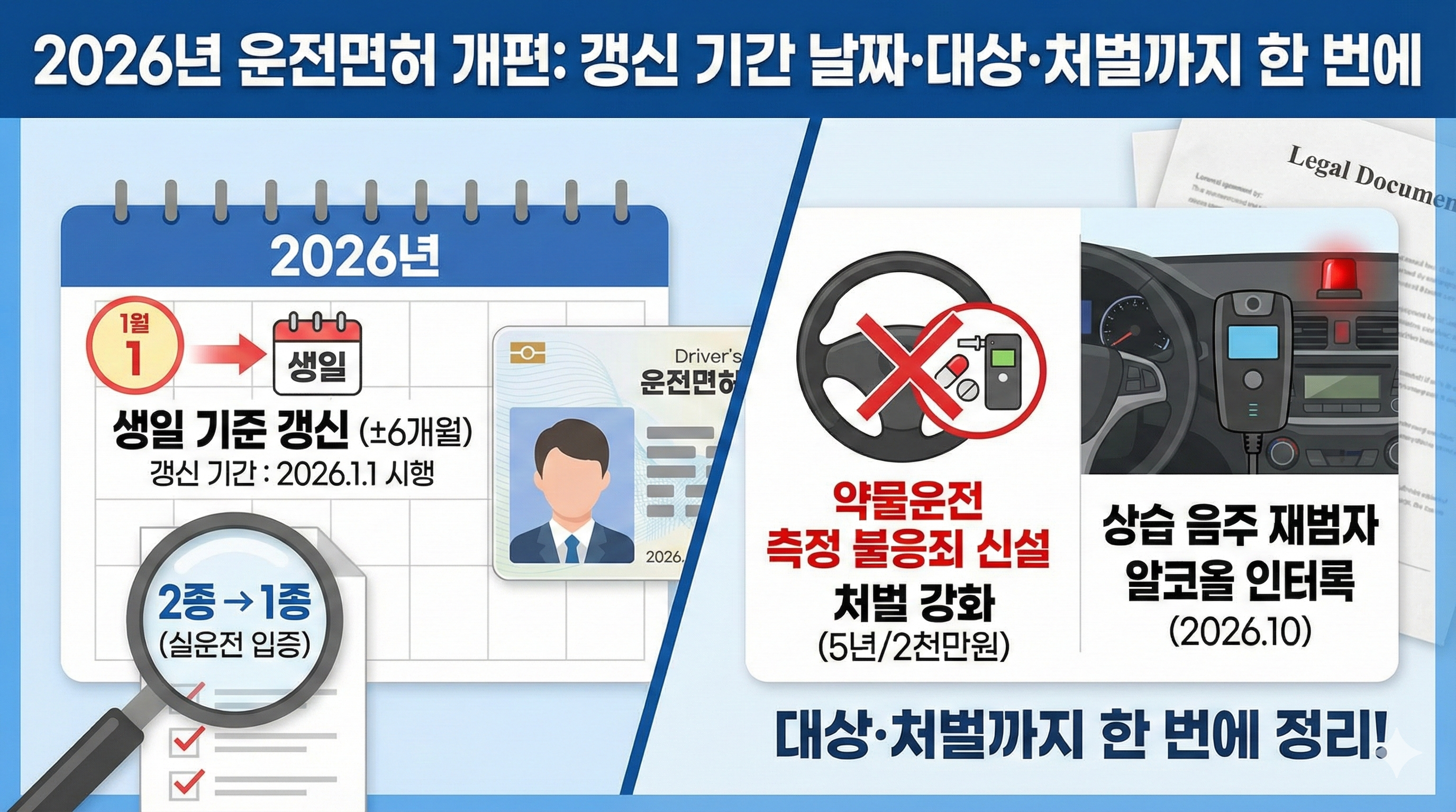 2026 운전면허 제도 변경을 ‘내가 뭘 해야 하는지’로 정리했습니다. 생일±6개월 갱신, 약물 측정 불응죄, 인터록 조건부 면허, 2종 ⇀ 1종 전환 기준까지 포함합니다.