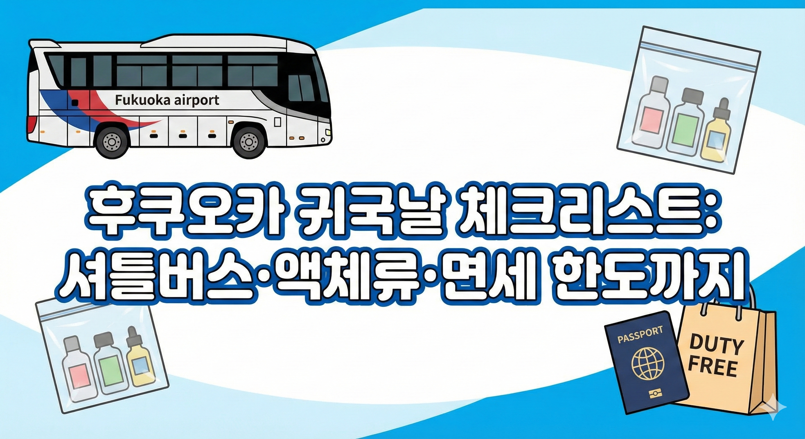 후쿠오카 귀국날 스트레스 줄이는 법: 국내선⇀국제선 이동(셔틀버스), 시간표, 택스프리 봉투, 액체류 규정, 한국 면세 한도까지 한 번에 정리.