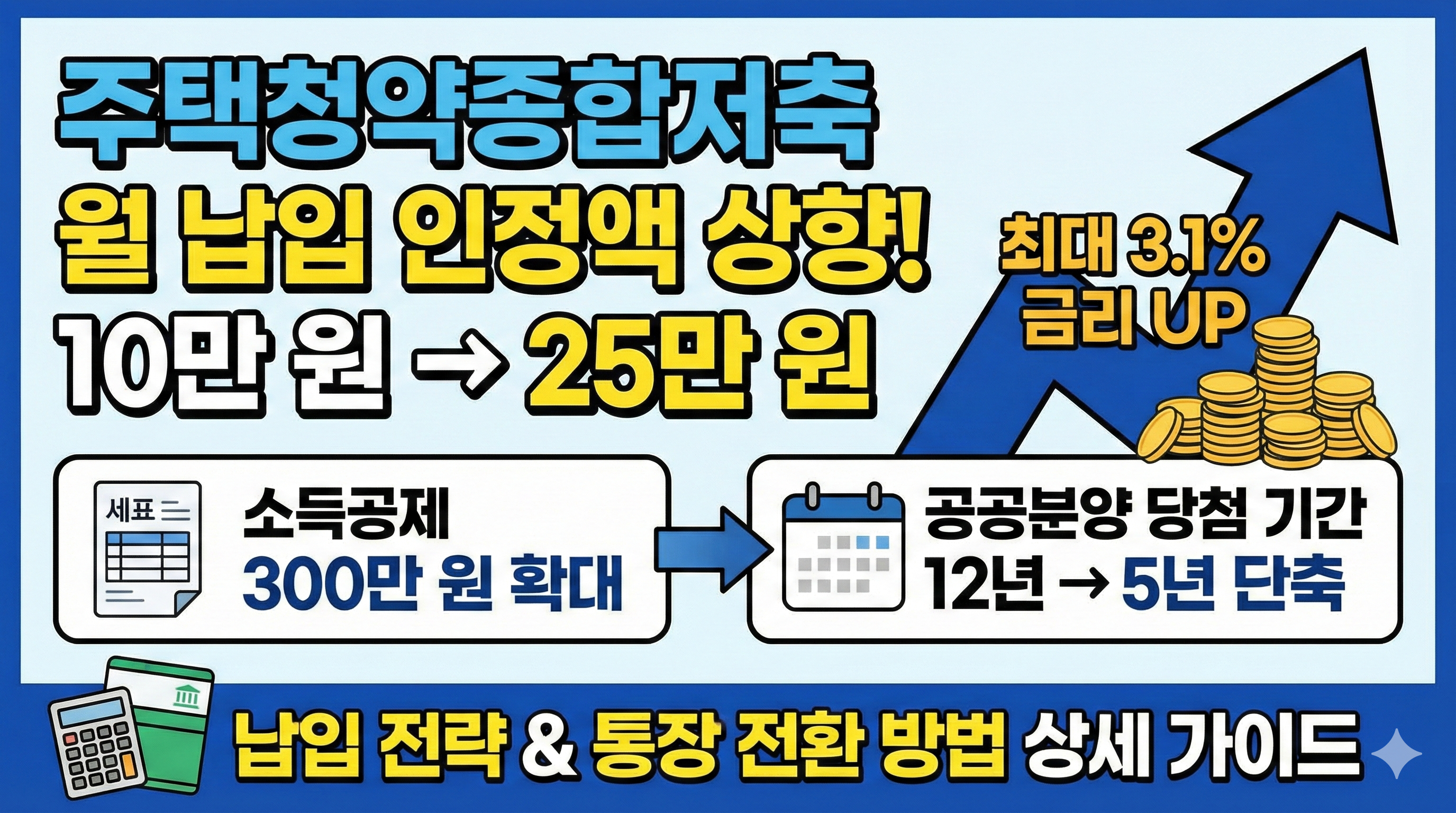 주택청약종합저축 월 납입 인정액이 10만 원에서 25만 원으로 상향되었습니다. 최대 3.1%로 오른 금리와 300만 원으로 확대된 소득공제 혜택을 확인하세요. 공공분양 당첨 기간을 12년에서 5년으로 단축시키는 납입 전략과 통장 전환 방법을 살펴볼게요.