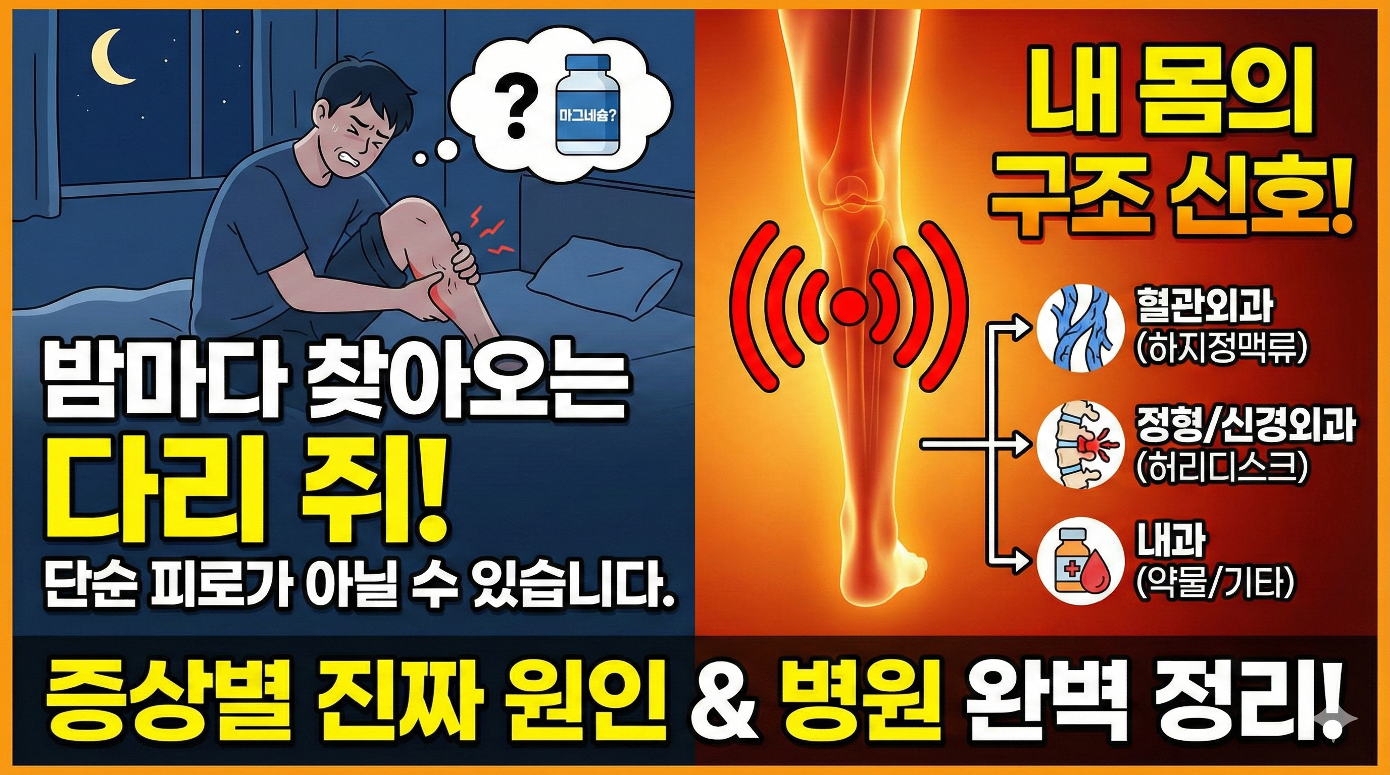 밤마다 찾아오는 다리 쥐, 단순 피로가 아닐 수 있습니다. 마그네슘을 챙겨 먹어도 그대로라면? 하지정맥류부터 허리디스크까지, 내 다리 통증의 진짜 원인과 증상에 따라 가야 할 병원(진료과)을 완벽하게 정리해 드립니다.