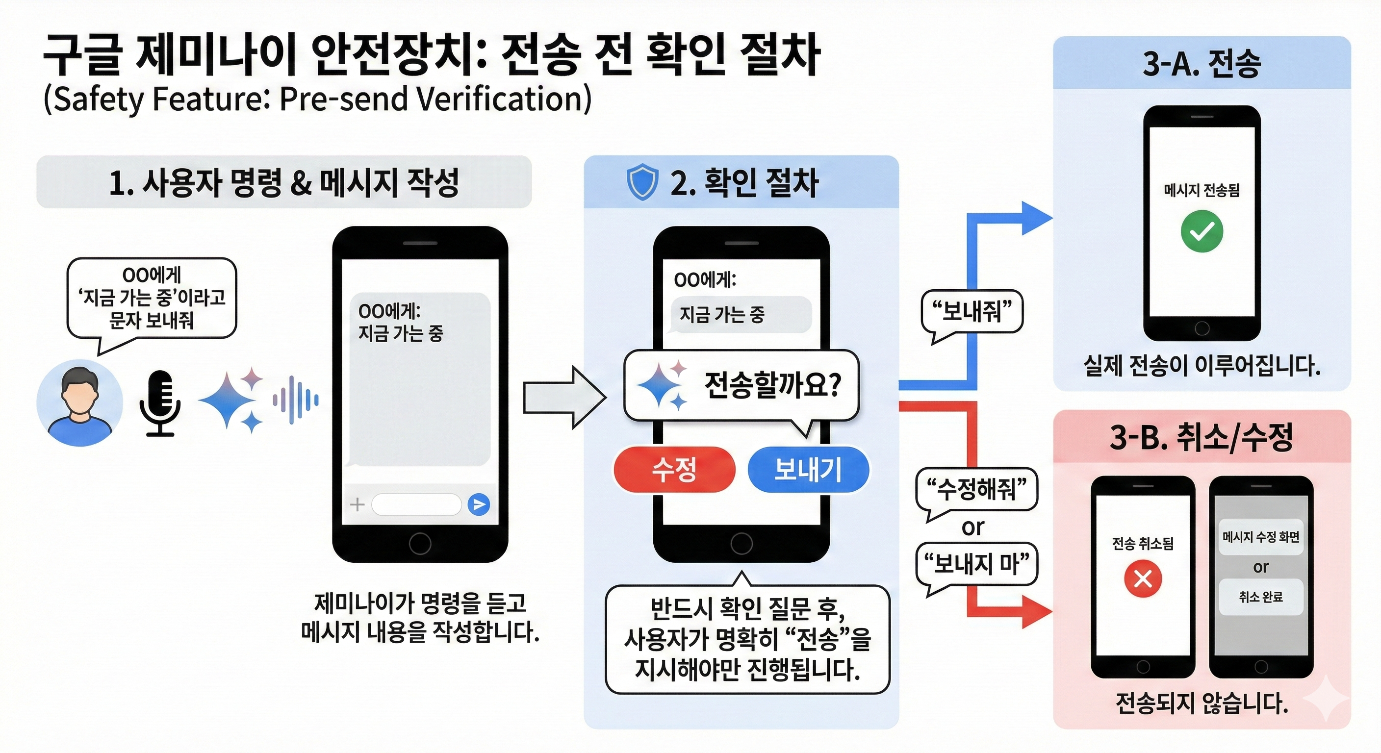 제미나이는 작성된 메시지를 보여주며 "전송할까요?" 또는 "보내도 될까요?"라고 묻습니다,. - 수정 및 취소: